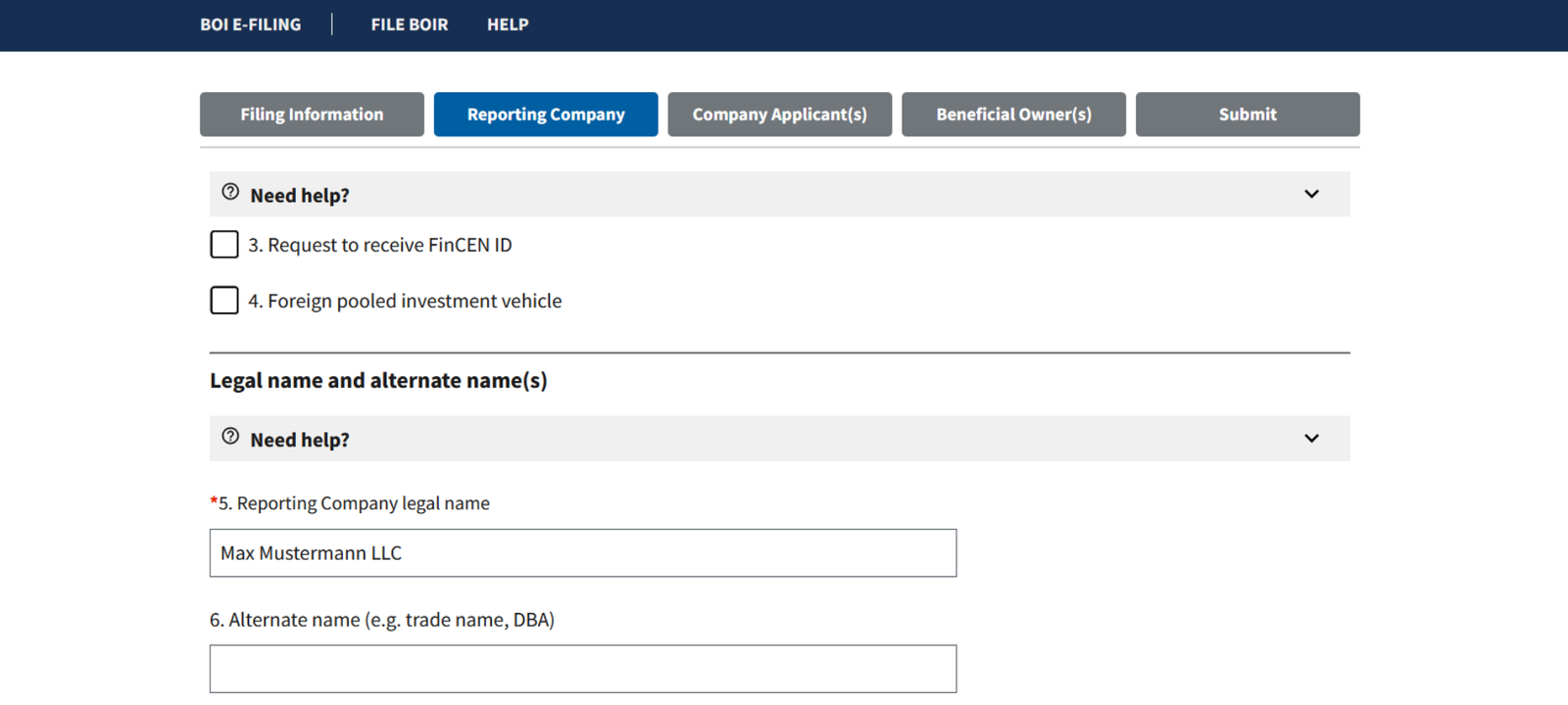 Schritt 7: Feld „Existing Reporting Company“