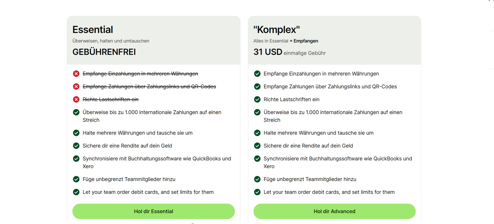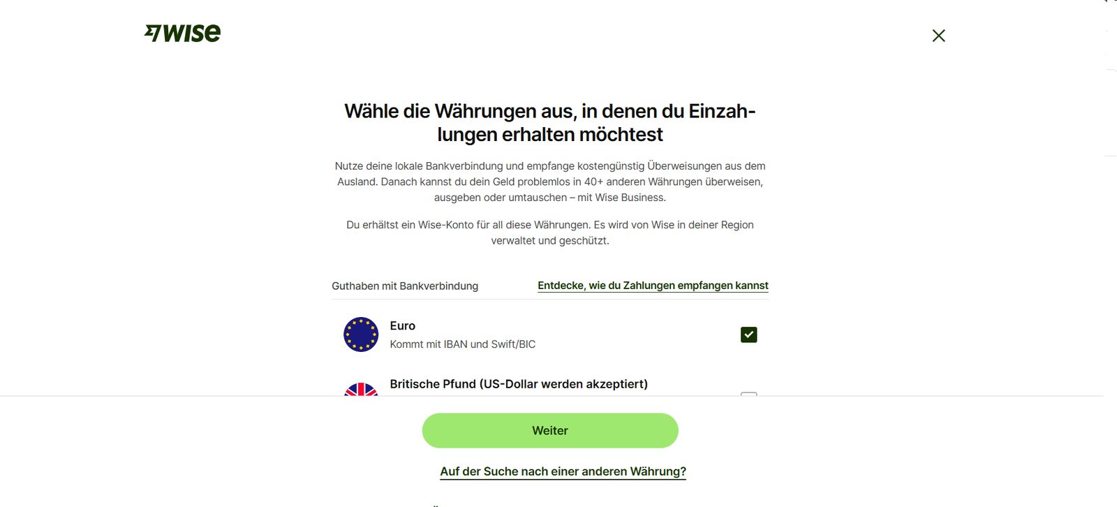 Wähle im nächsten Schritt die Währung, in der du die erste Einzahlung vornehmen möchtest, und bezahle anschließend die 31 $ für den Advance-Tarif. Diese Gebühr aktiviert dein Wise Business Konto vollständig und ermöglicht dir den Zugriff auf alle Funktionen.