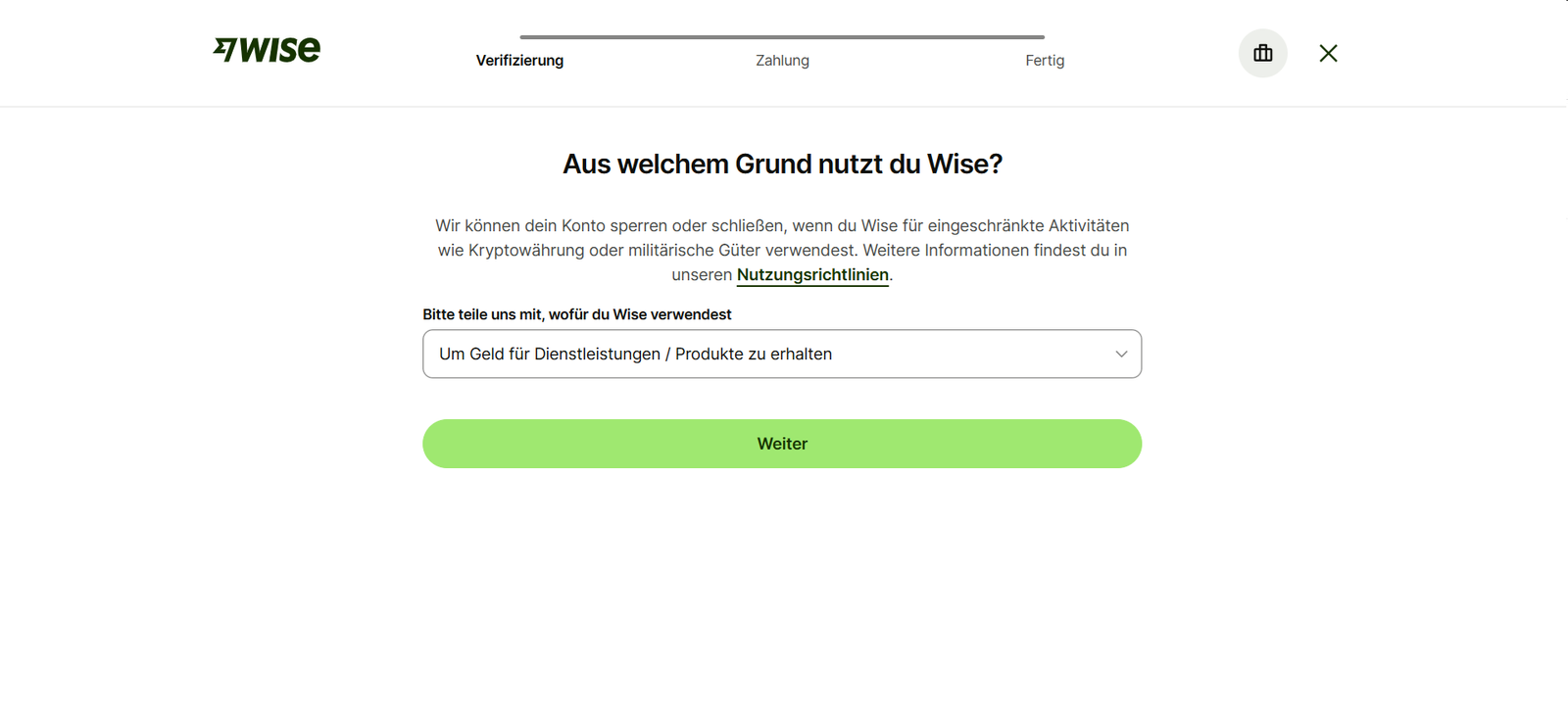 Schritt 12: Grund für dein Wise-Konto auswählen