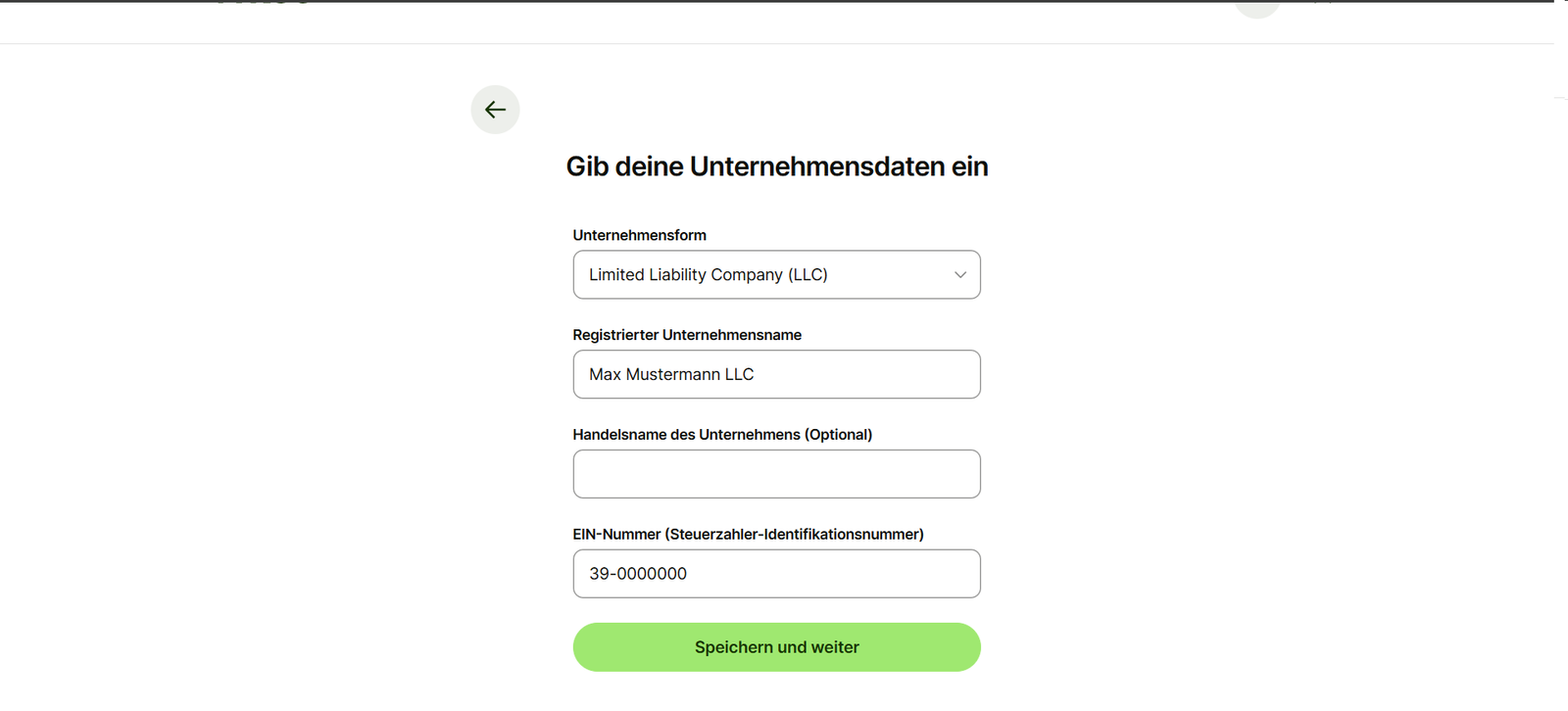 Gib nun alle grundlegenden Informationen zu deiner LLC im Fließtext ein. Wähle als Unternehmensform LLC, trage den vollständigen Namen deiner LLC exakt so ein, wie er im Gründungsdokument steht, und füge anschließend deine EIN (Steuernummer) hinzu. Diese findest du auf dem offiziellen IRS-Dokument, dem 147C Letter. Achte darauf, alle Angaben korrekt zu übernehmen, damit die Verifizierung ohne Probleme durchläuft.