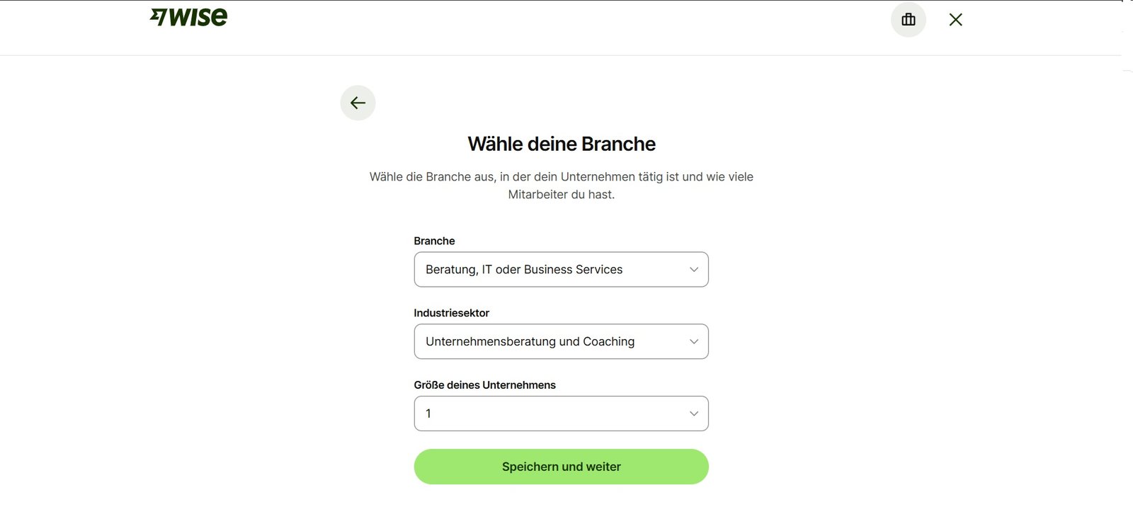 Im nächsten Schritt möchte Wise einige Grundinformationen über dein Unternehmen erhalten. Gib daher an, in welcher Branche und in welchem Sektor deine LLC tätig ist und wähle außerdem die ungefähre Größe deines Unternehmens aus. Diese Angaben helfen Wise dabei, dein Konto korrekt einzustufen und mögliche Rückfragen zu vermeiden.