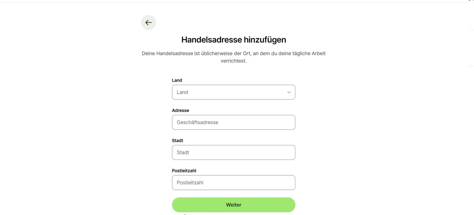 Solltest du keine feste Adresse haben oder deine private Adresse nicht angeben wollen, können wir dir auf Wunsch eine passende Handelsadresse zur Verfügung stellen.