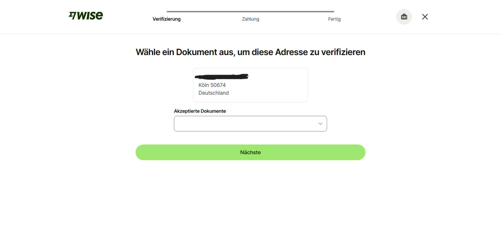 Zum Abschluss musst du deine Handelsadresse verifizieren. Dafür lädst du ein Dokument hoch, auf dem dein Name und deine Adresse eindeutig erkennbar sind. Am häufigsten eignet sich dafür ein Kontoauszug. Obwohl Wise offiziell angibt, dass der LLC-Name darauf erscheinen muss, akzeptieren sie in der Praxis meist auch Unterlagen, auf denen nur dein persönlicher Name zusammen mit der Adresse steht. Alternativ kannst du auch eine Stromrechnung, Handyrechnung oder deinen Mietvertrag verwenden.