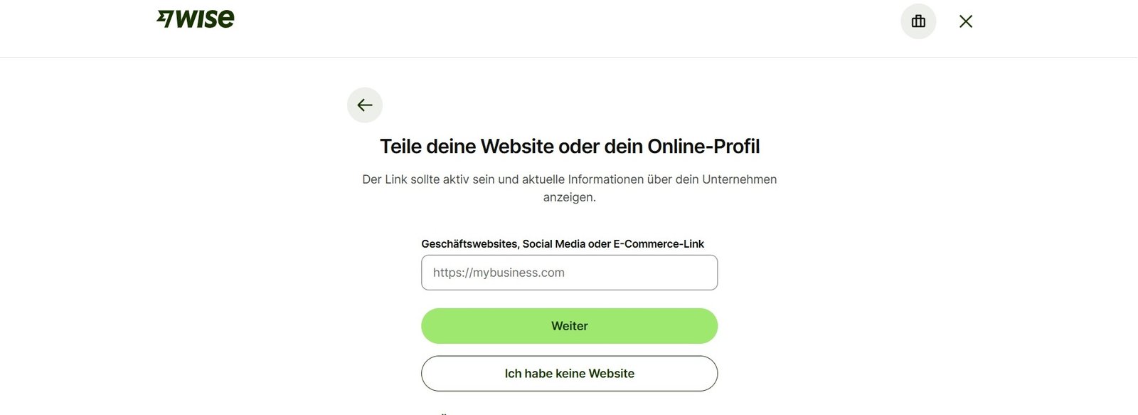 Wenn deine LLC bereits über eine Webseite verfügt, gib hier einfach die URL ein. Falls du noch keine Webseite oder kein Online-Profil hast, wähle die Option „Ich habe keine Webseite“ aus. Das hat keinen negativen Einfluss auf die Kontoeröffnung.