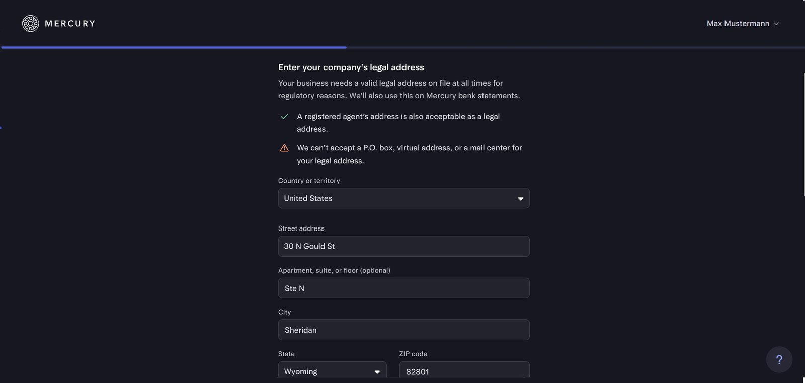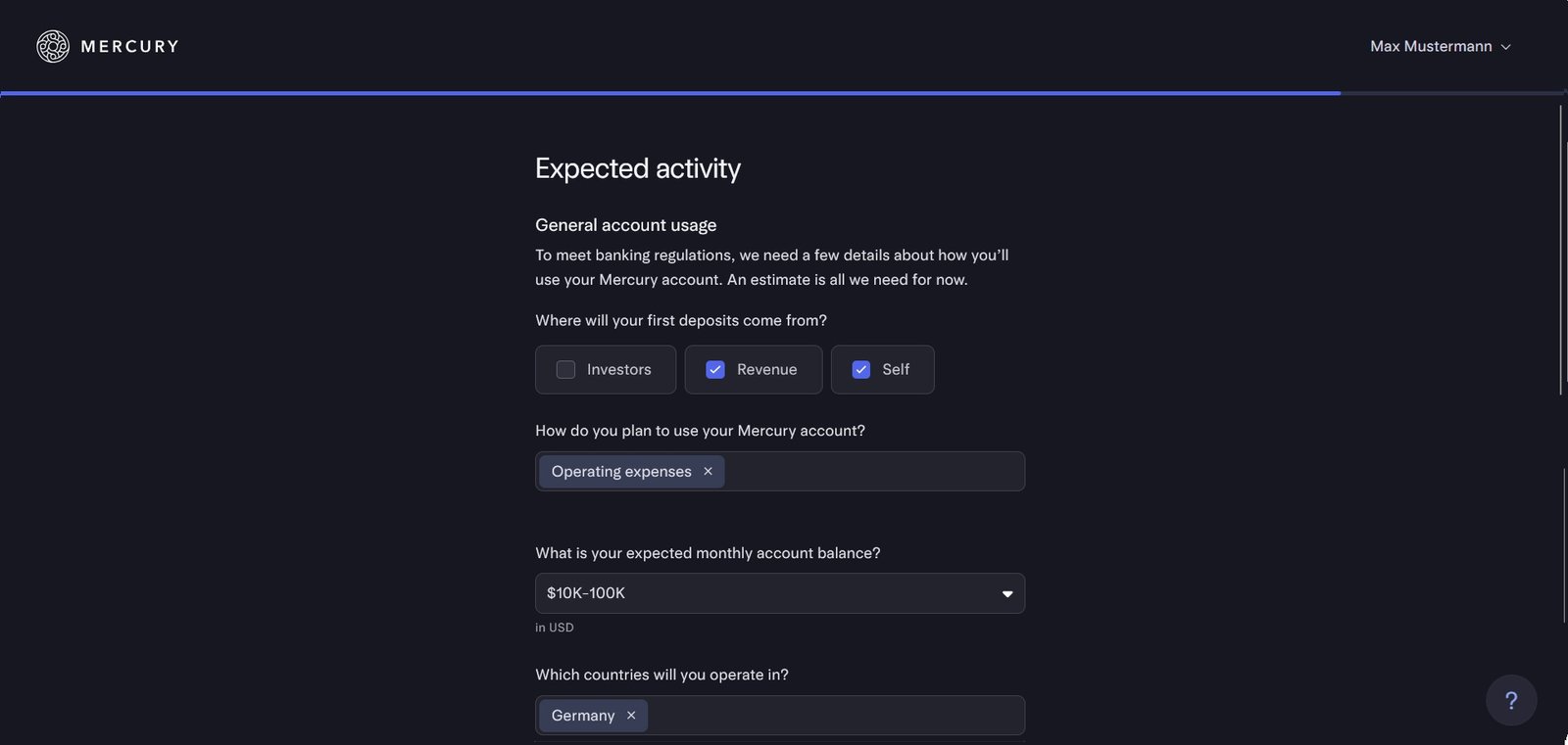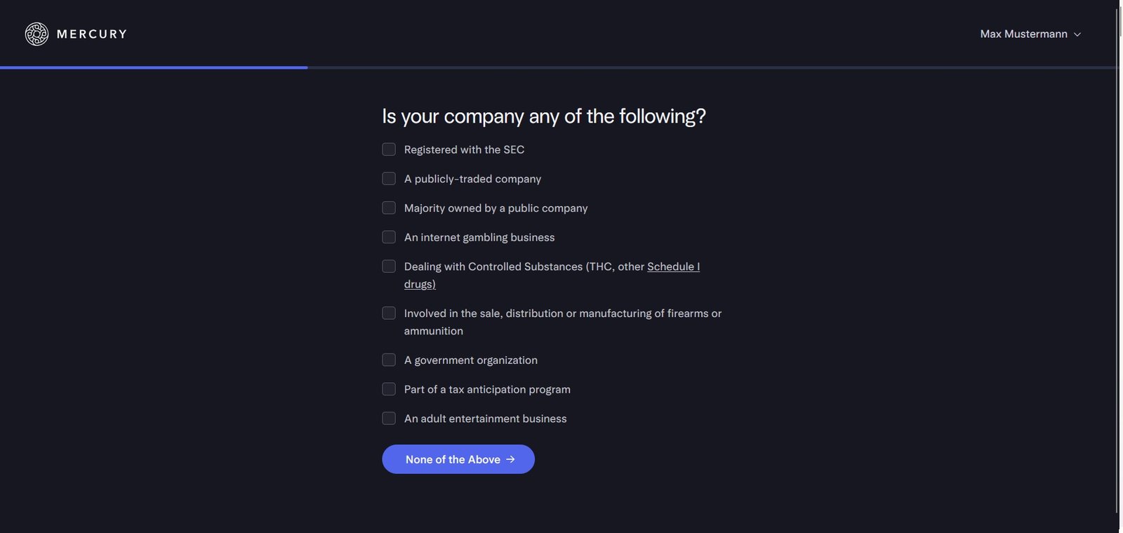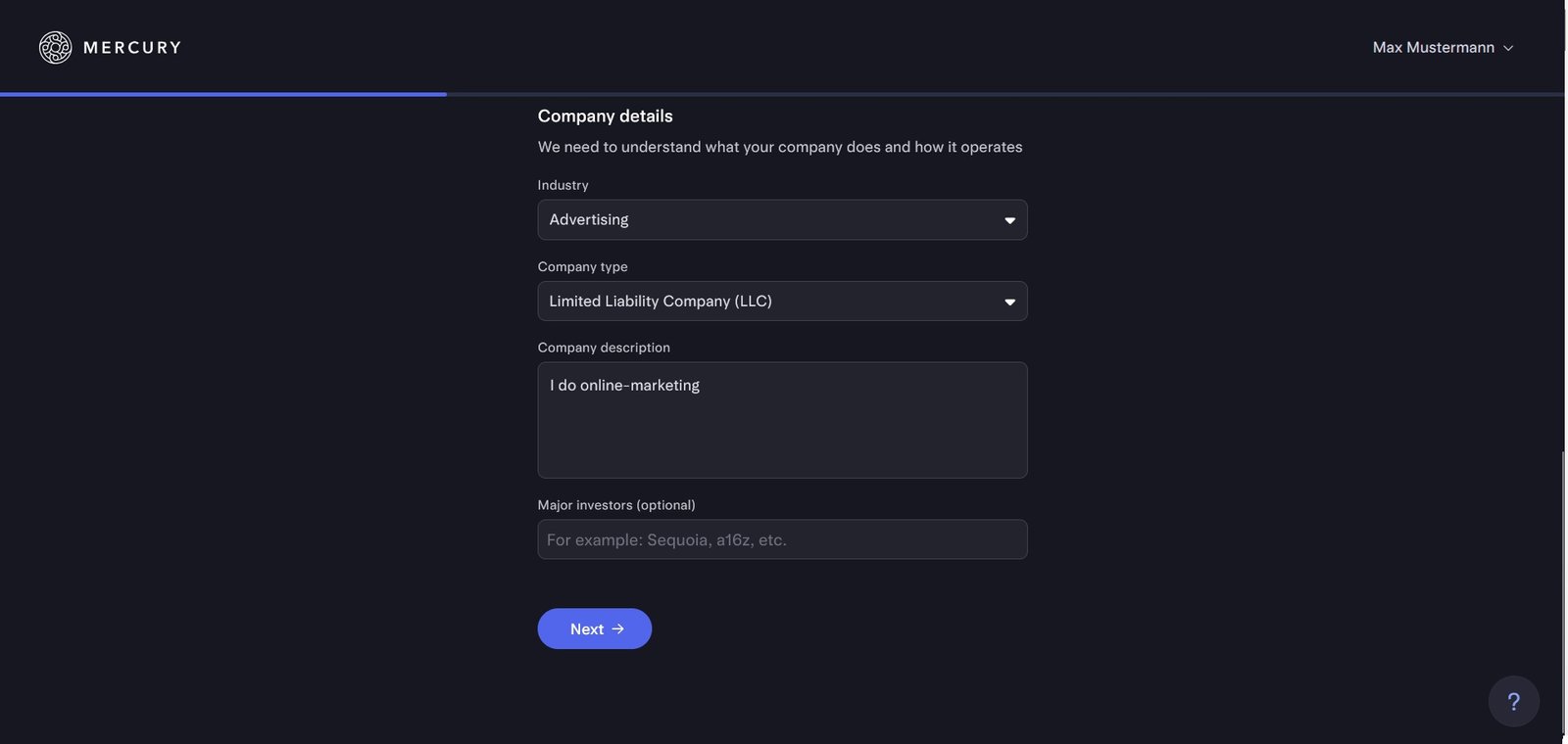 Mercury fragt nun ab, ob deine LLC in bestimmten regulierten oder verbotenen Branchen aktiv ist (z. B. Waffenhandel, Glücksspiel, Geldtransferdienste usw.).