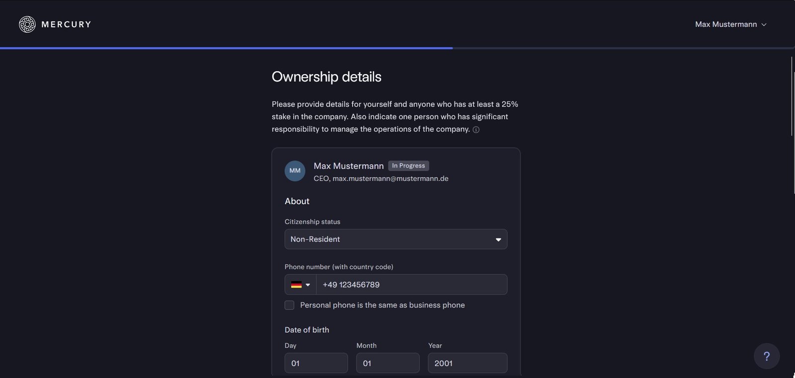Gib hier deinen Staatsbürger-Status, dein Geburtsdatum und deine Handynummer ein.