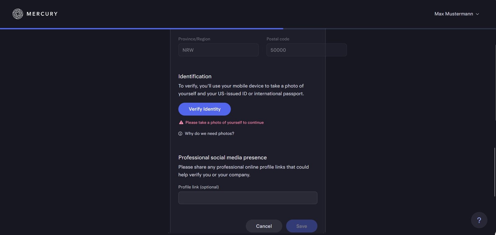 Klicke nun auf „Verify Identity“, um dich als Person zu verifizieren.