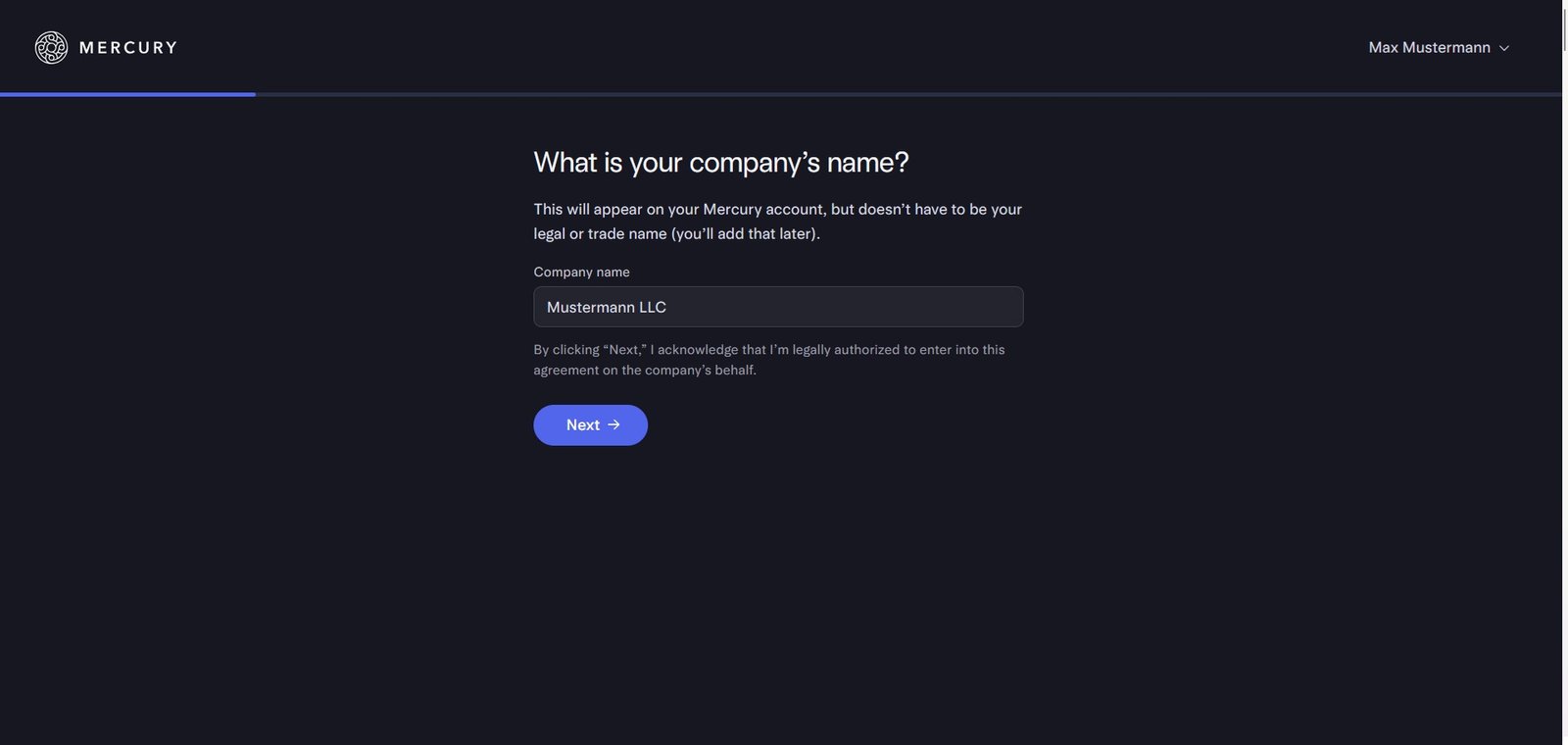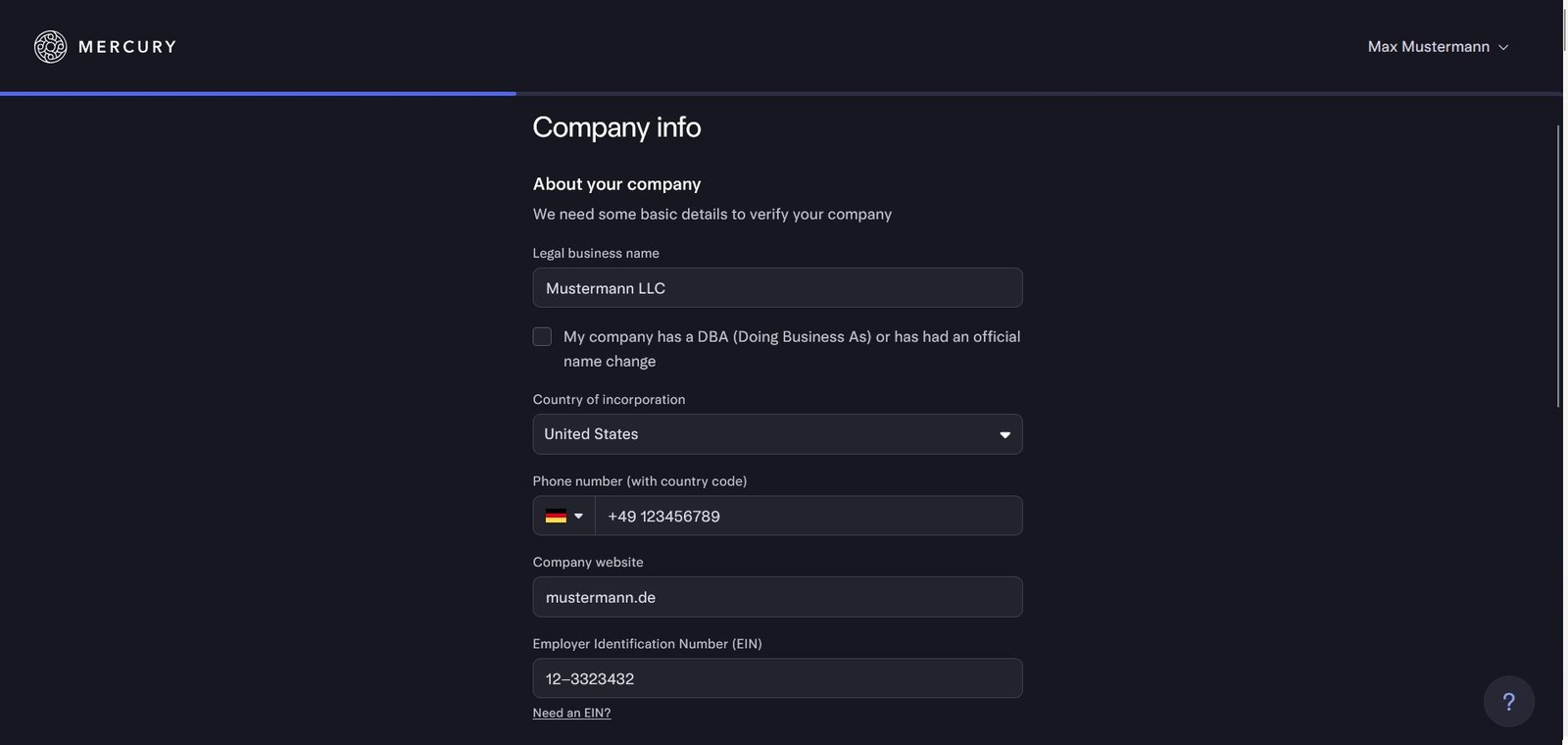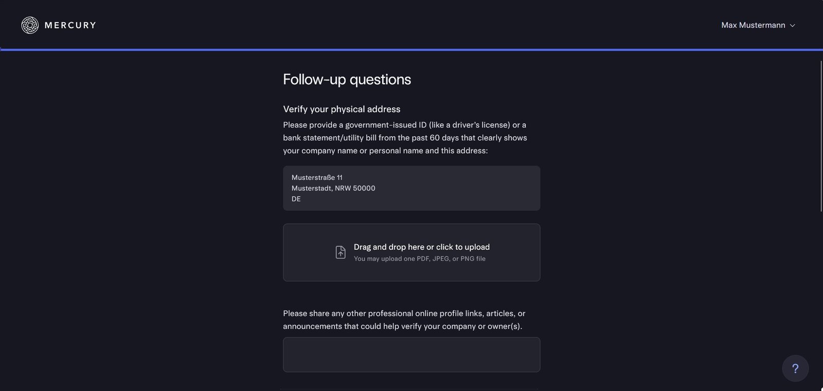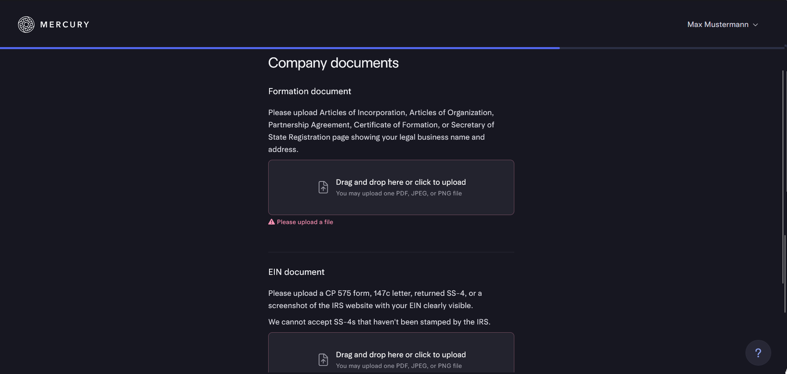Lade hier dein Gründungsdokument sowie den EIN Letter (147C) hoch, damit Mercury deine LLC verifizieren kann.